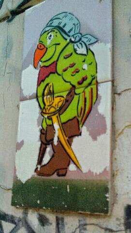 Kachel Street Art Seeräuber Papagei. Saturday night feever (Autokorektur macht nicht feever daraus). Ein einbeiniger Papagei.